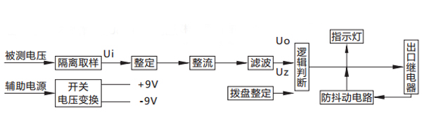 被測(cè)電壓經(jīng)過電阻分壓取樣,得到與被測(cè)電壓成比例的取樣電壓Ui , Ui經(jīng)撥盤整定,再進(jìn)行整流濾波,得到直流Uo ,邏輯回將Uo與門坎電壓Uz進(jìn)行比較。對(duì)欠電壓繼電器,若Uo> Uz ,則出口繼電器不動(dòng)作;若Uo Uz ,則出口繼電器動(dòng)作。